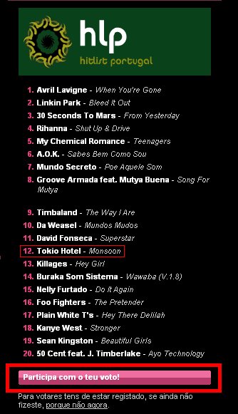 Uma queda drástica deu-se na HLP! Os Tokio Hotel, que estavam prestes a cumprir a sua 12º semana no 1º lugar da HLP, passaram para o 12º lugar!´ Desconhecemos as causas, mas existem várias tentativas de explicação: - A musica Monsoon caiu no esquecimento. (teoria parv…