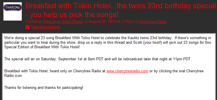 Estamos a fazer uma especial 23º música para o Breakfast With Tokio Hotel para celebrar o 23º aniversário dos gémeos Kaulitz. Se houver alguma coisa em particular que queiras ouvir durante a emissão, envia-nos uma resposta neste tópico e o Scott (o teu locutor!) vai seleccionar 23 músicas para esta edição especial do Breakfast With Tokio Hotel!