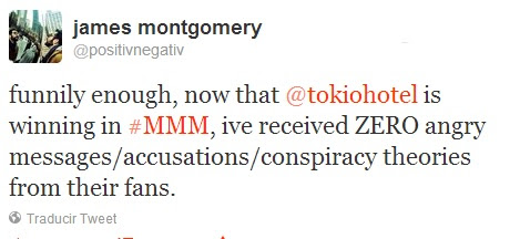 Curiosamente, agora que os @tokiohotel estão a ganhar no #MMM, recebi ZERO mensagens furiosas/acusações/teorias da conspiração dos seus fãs